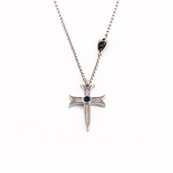 La croce Cadice é realizzata in acciaio 316L con una texture squamata e una pietra centrala quadrata in lapislazuli blu. La catena rolò sempre in acciaio 316L è regolabile con lunghezza 45 e 50 cm.