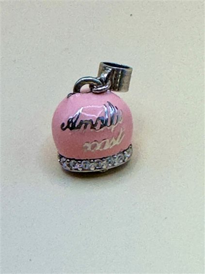 CIONDOLO CAMPANELLA SMALTATO ROSA CON ZIRCONI, ACCOMPAGNATO DA LEGGENDA DI SAN MICHELE ARCANGELO, DONATORE DELLA FAMOSA CAMPANELLA PORTAFORTUNA