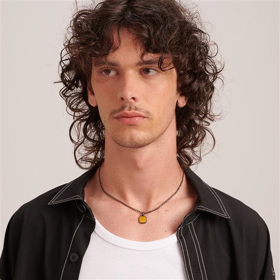 Collana catena grumetta girocollo in acciaio 316L e finitura pvd colore rutenio con pendente con occhio di tigre giallo.