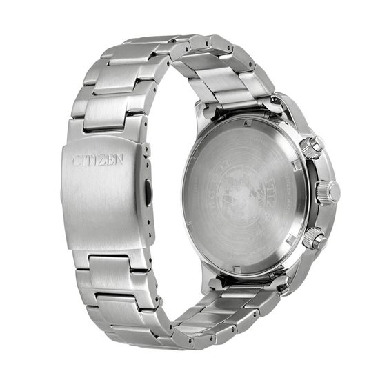 Orologio cronografo Citizen modello AVIATOR CHRONO. Cassa in acciaio spazzolato e lucido, fondo serrato a vite, ansa 22 mm. Movimento Eco-Drive a carica luce con riserva di carica a 270 giorni. Cronografo a 1/5 di sec. fino a 60 minuti. Vetro minerale. Qaudrante blu , lancette luminose - data ore 3. Lunetta nera con indicatore punti cardinali. Bracciale regolabile in acciaio spazzolato con chiusura déployante con pulsanti. Impermeabile 10 atm(WR 10 bar). Garanzia 2 anni.