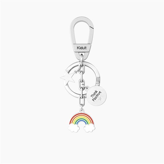 Portachiavi in acciaio 304/316L satinato con arcobaleno smaltato, ciondolo tondo con cristalli e stella. Scritta: Think Positive. Dimensioni: moschettone Ø 35 mm, ciondolo arcobaleno 22x19 mm, ciondolo tondo Ø 16 mm, ciondolo stella 12.50 mm.