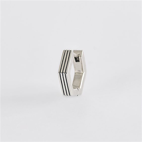 Orecchino esagonale allungato in argento brunito con finitura rigata. • Dimensione dell'orecchino: 14 x 12 mm • Misura unica • Materiale: Argento 925