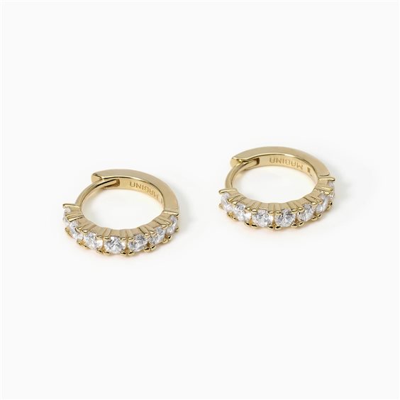 Orecchini in argento 925 placcato oro giallo 18Kt e zirconi bianchi. Cerchio con chiusura a clic, liscio dietro, 7 pietre frontali. Ø esterno mm 15.