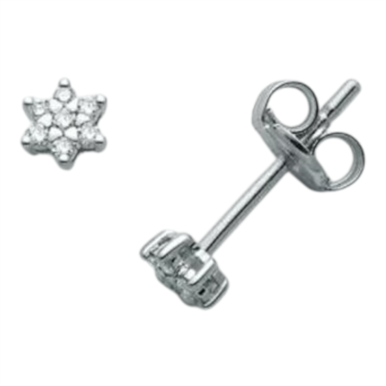 Orecchini realizzati in oro bianco 750/°°° con 14 diamanti taglio brillanti 0,078 ct. Chiusura con perni a farfalline. Diamanti G colo