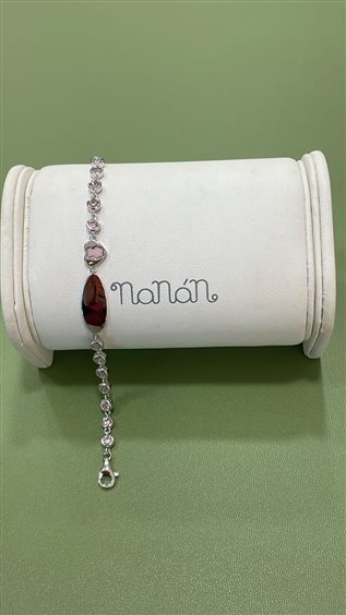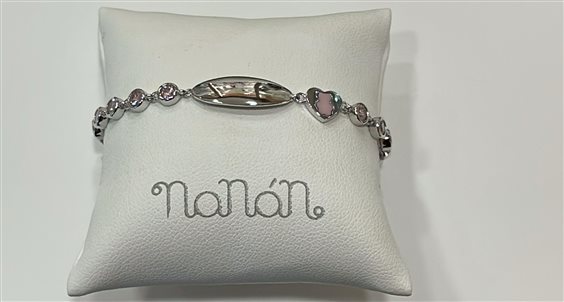 BRACCIALE NANAN TENNIS IN ARGENTO 925 CON ZIRCONI ROSA, MISURA 13 CM, CON TARGHETTA CENTRALE E CUORE CON ORSETTO ROSA.