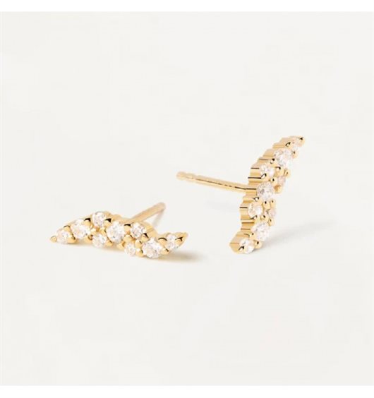 Orecchini a lobo realizzati in argento 925% con finitura in oro 18kt e impreziositi da zirconi bianchi dal diametro di 1,5 mm e 2 mm. Hanno lunghezza totale di 1,2 cm e peso di circa 1,41 g.