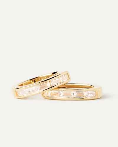 Materiale: argento sterling Finitura: placcatura in oro 18k Pietre: zirconi bianchi Diametro esterno del cerchio: 13,6 mm Diametro interno del cerchio: 10 mm Larghezza dell'anello: 2,5 mm Peso: 2,50 g
