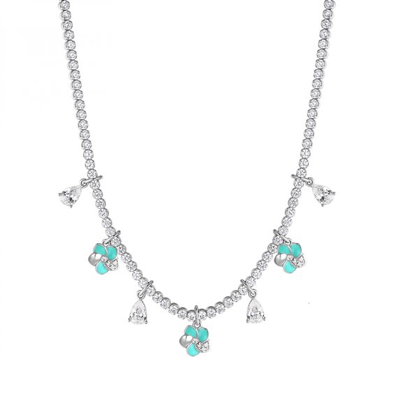 Collana tennis in argento 925‰ con pendenti a forma di fiori,16 zirconi bianchi, smalto turchese