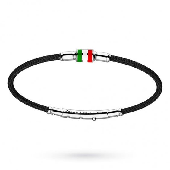 Bracciale da uomo in argento e kevlar nero.E' impreziosito da un cilindro smaltato con i colori della bandiera italiana. La chiusura in acciaio 316L medicale è regolabile su tre posizioni.Questo prodotto appartiene alla collezione Robikevlar. mis. 21 regolabile