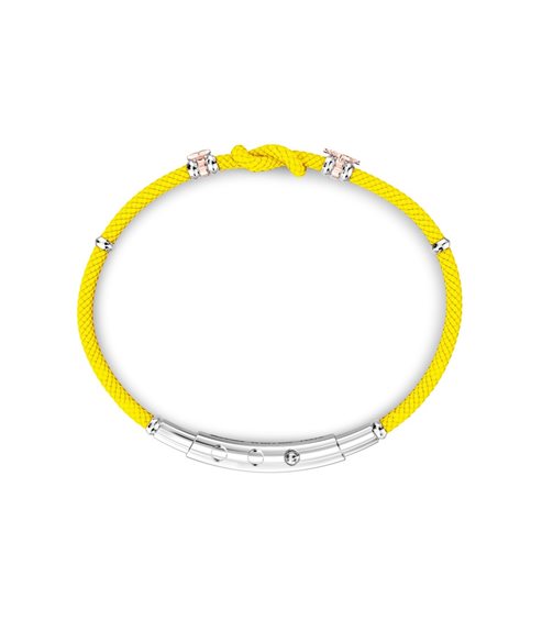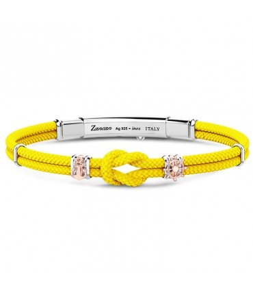 Bracciale Zancan con cordino in kevlar giallo, nodo nautico ed elementi nautici quali Ancora e Timone, in argento 925% placcato oro rosa 18 carati. Bracciale da uomo con chiusura regolabile in acciaio 316L, della collezione "Regata". Lunghezza Bracciale regolabile da 19 a 21 cm. Peso totale 2,10 grammi.